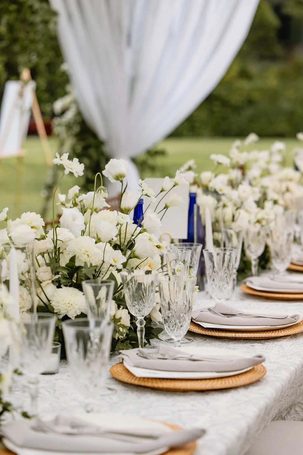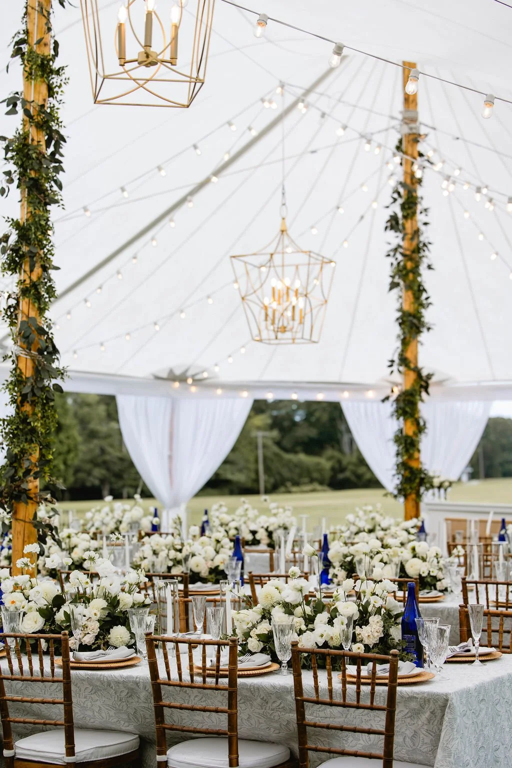 Inside the sailcloth tent, garden-style arrangements layered soft white florals with flowing greenery, creating depth, movement, and a refined coastal atmosphere perfect for high-end private estate weddings.