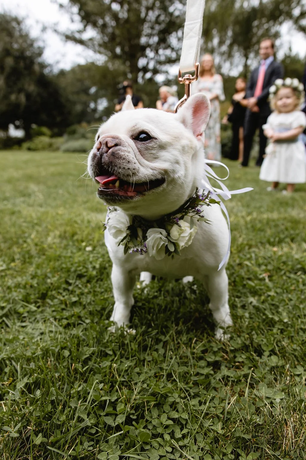 The ceremony featured white blossoms accented with faint hints of purple and blue, using vining elements and seasonal stems to frame the couple in a natural, meadow-inspired aesthetic that blended beautifully with the property.