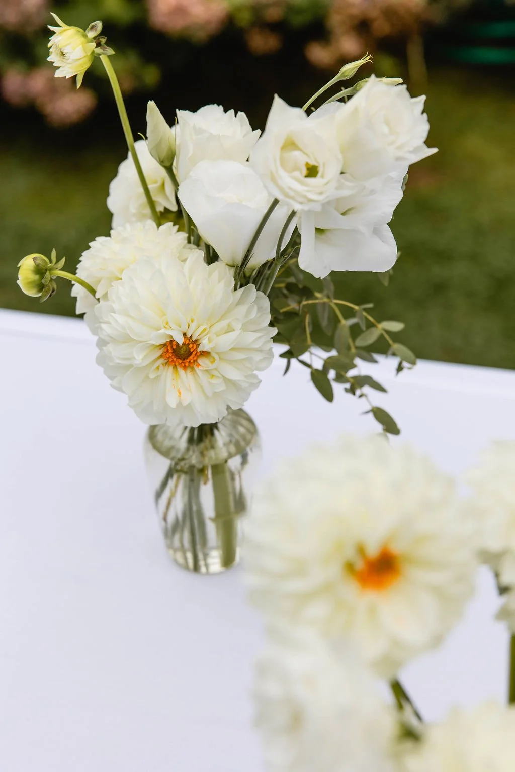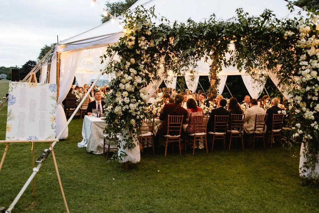 This private residence wedding in South Dartmouth, MA featured a natural, romantic garden-style floral design that brought seasonal movement, soft white blossoms, and subtle touches of purple and blue into an elegant luxury tented setting.