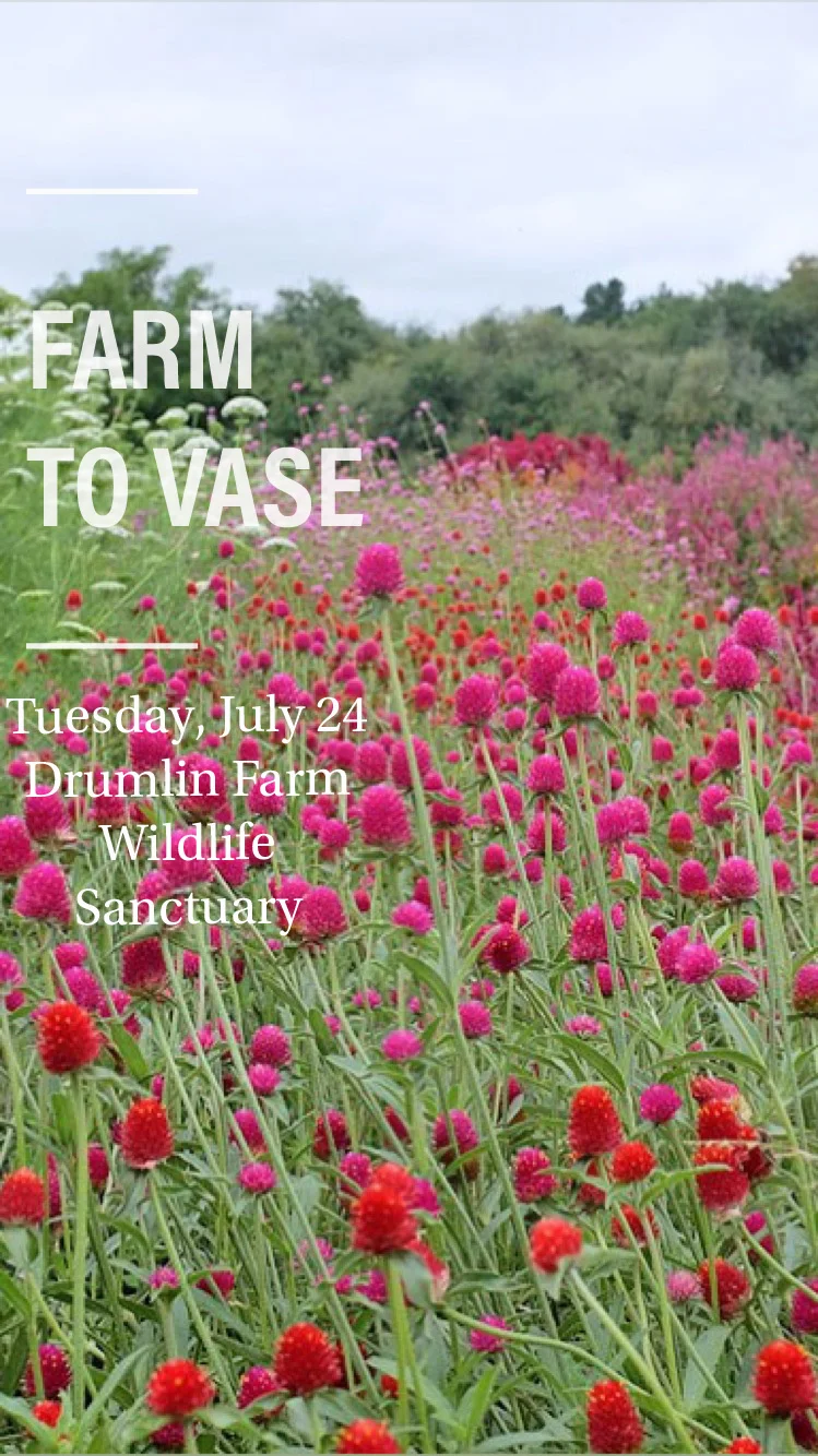 We are so excited to announce our collaboration with Drumlin Farm Wildlife Sanctuary, this summer! We will be teaching a floral arranging class at the sanctuary, Tuesday, July 24, 2018, from 6:00 pm - 9:00 pm. Join us in harvesting fresh farm flowers from Drumlin's beautiful fields, to create your own unique bouquet to take home. Instruction will include floral processing and techniques to tame wild flowers, as well as sculptural design tips.
