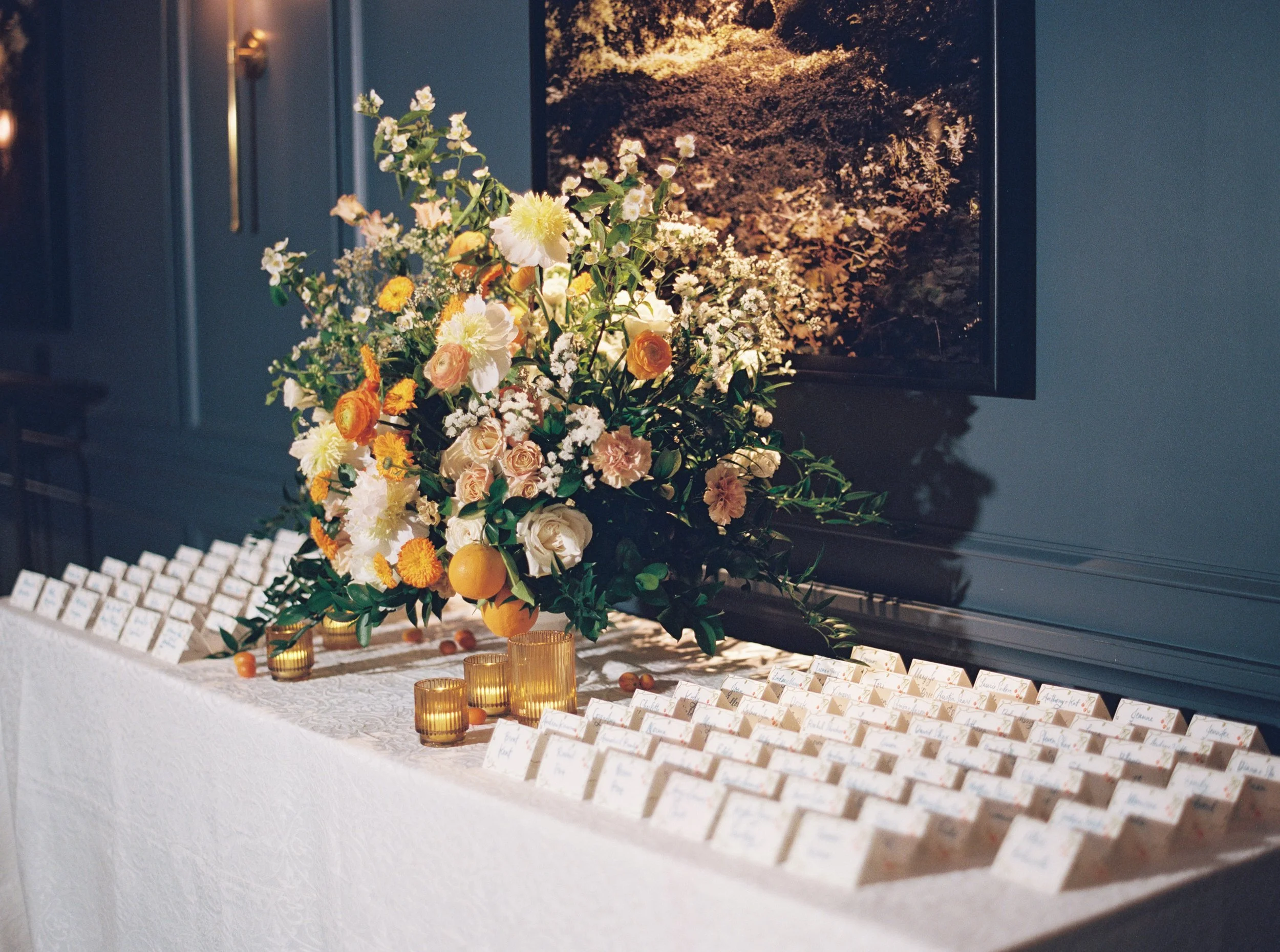 Moving into the reception, the vibrant citrus tones took center stage, with bright oranges, soft peaches, sunny yellows, creamy whites, and lush greens creating a visual feast for the senses. Accents of kumquats and apricots added a playful touch, while luxe garden arrangements adorned the tables, inviting guests to bask in the beauty of nature. Monoculture bud vases filled with unique locally grown blooms added a personalized touch, showcasing the couple's appreciation for their surroundings and commitment to supporting local artisans.