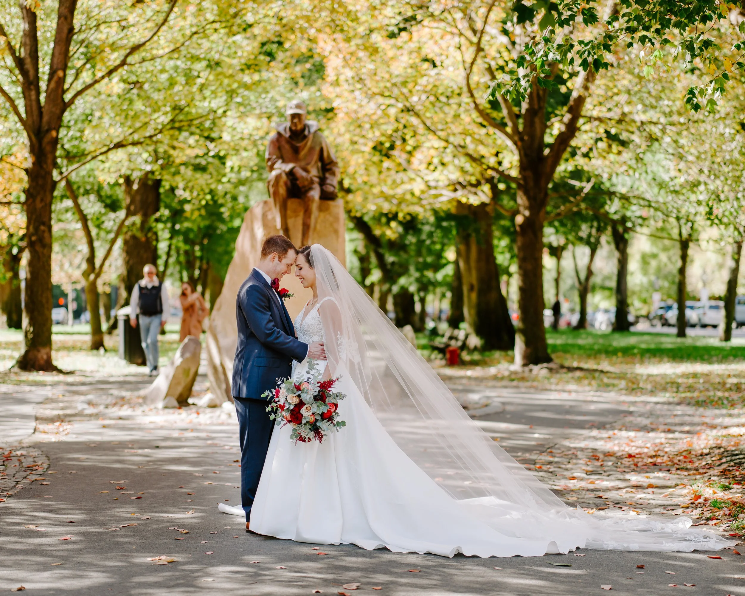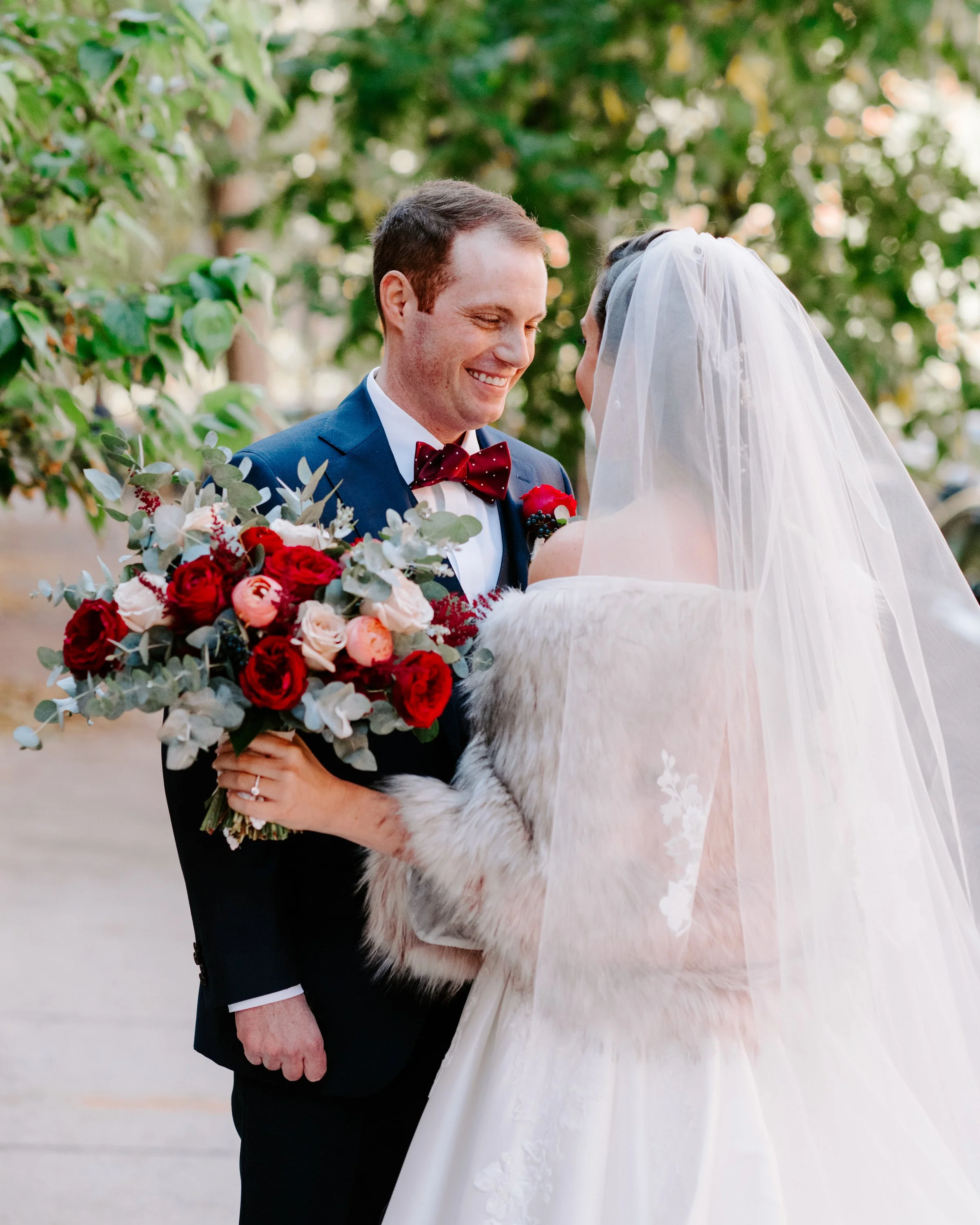 Kim and Brian were married on a crisp Boston fall afternoon. The entire day felt quintessentially Back Bay in October. The historic elegance of the Lenox — rich wood, glowing candlelight, and classic Boston charm — created the perfect backdrop for a fall palette that felt both romantic and bold.