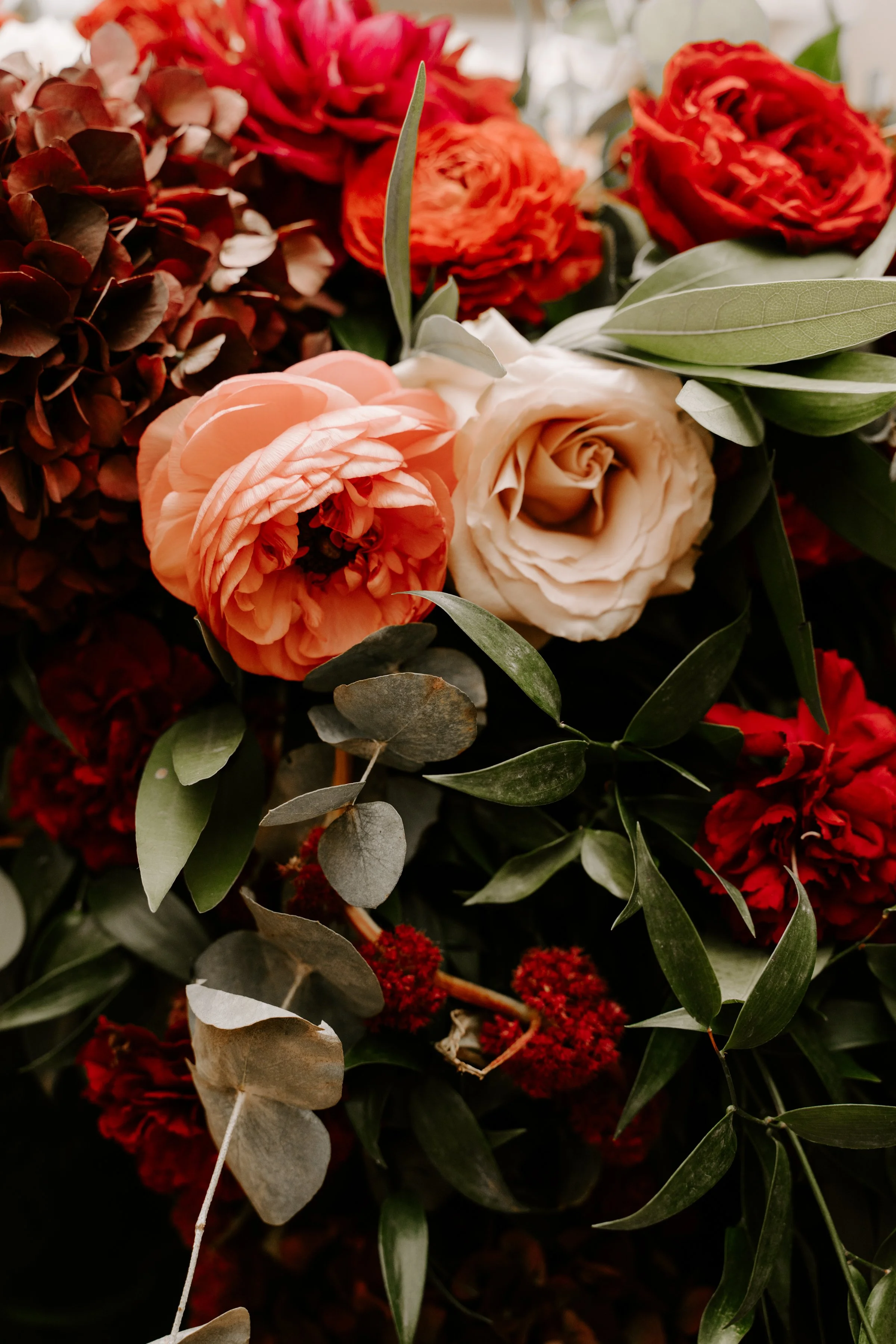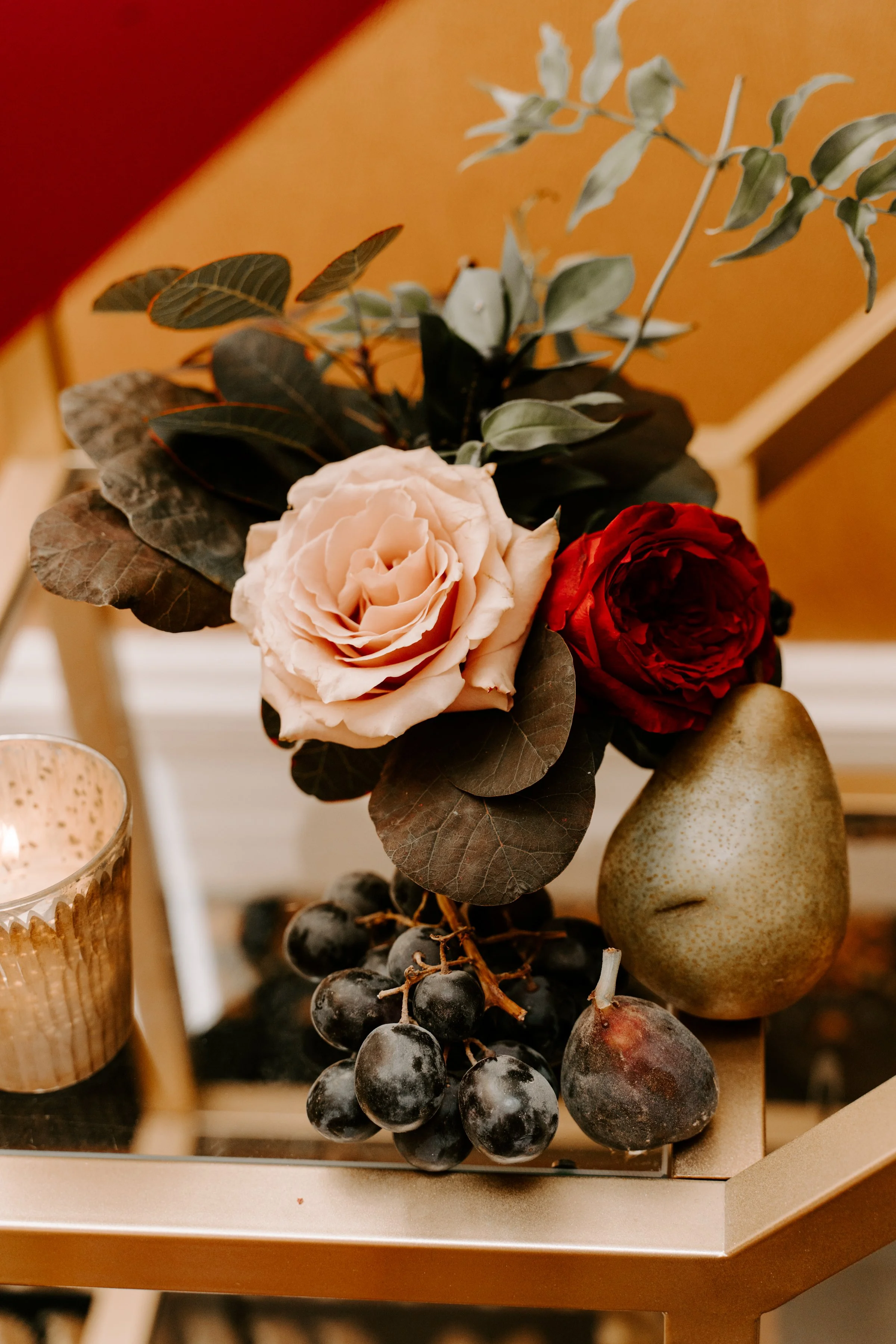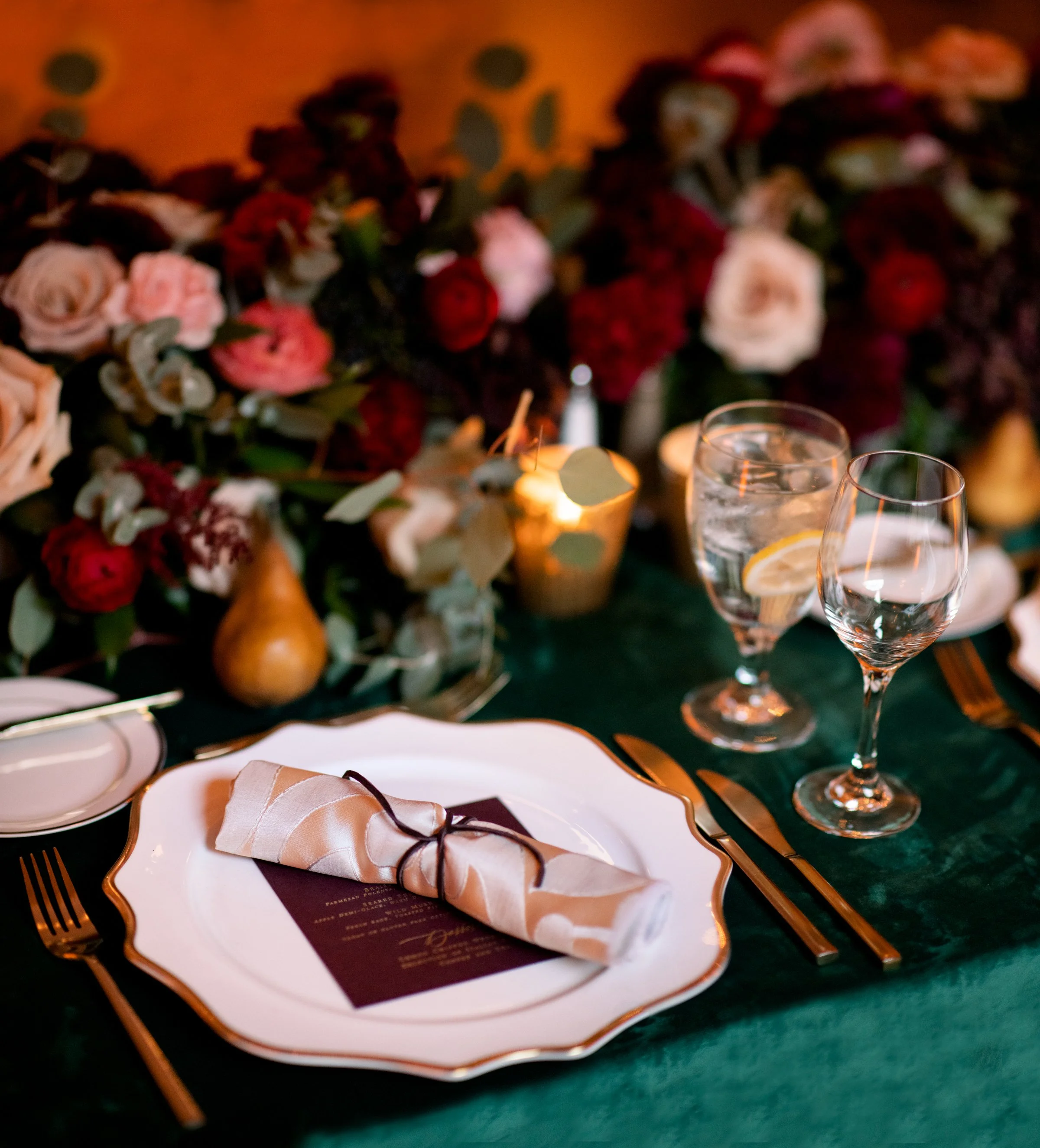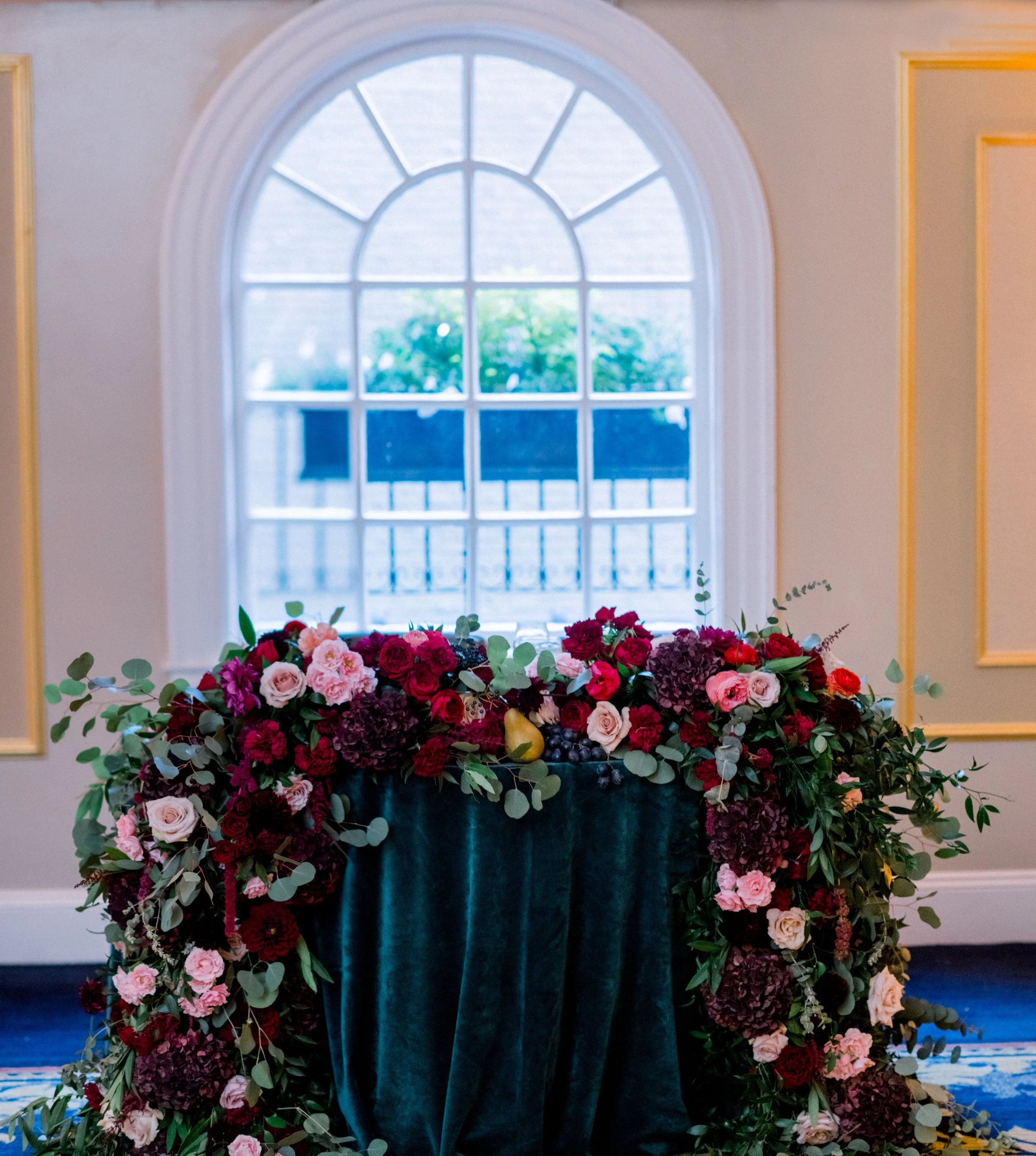 The reception at The Lenox Hotel was designed in deep, juicy berry tones inspired by the inside and outside of a ripe fig, layered with pops of coral peach and soft dusty rose for warmth and contrast. Tables were styled with accents of leather and green velvet, adding texture and depth against lush florals and abundant fruit details. Pears, figs, and cascading grapes were woven throughout the design, bringing a moody harvest feel that echoed the season and elevated the overall aesthetic.
