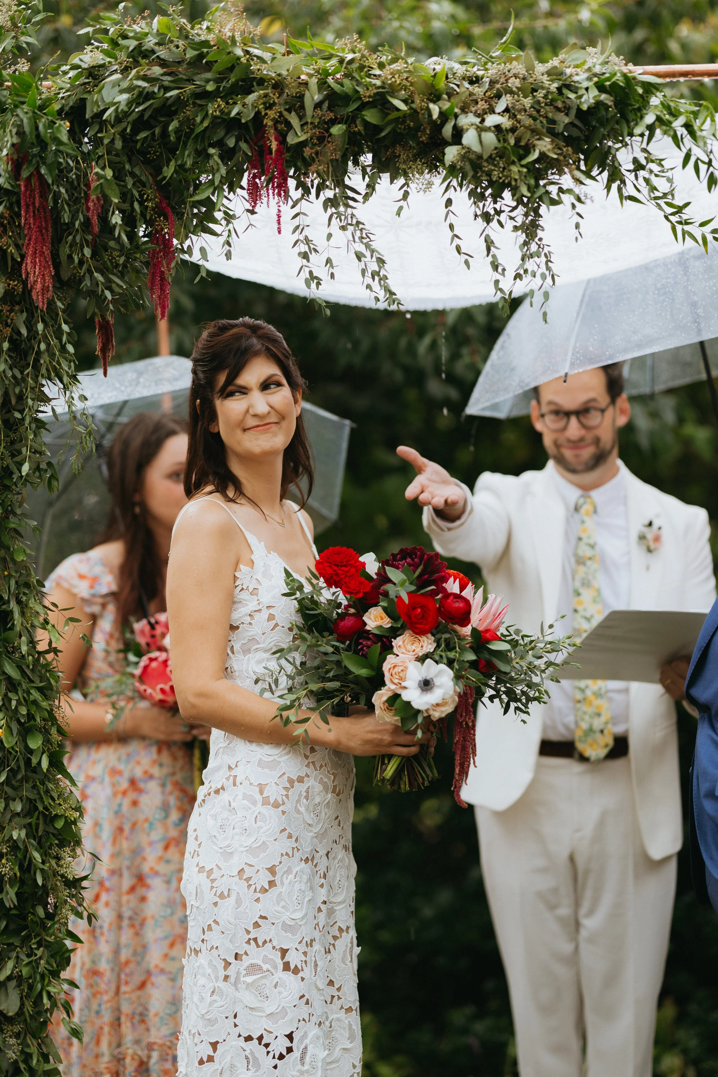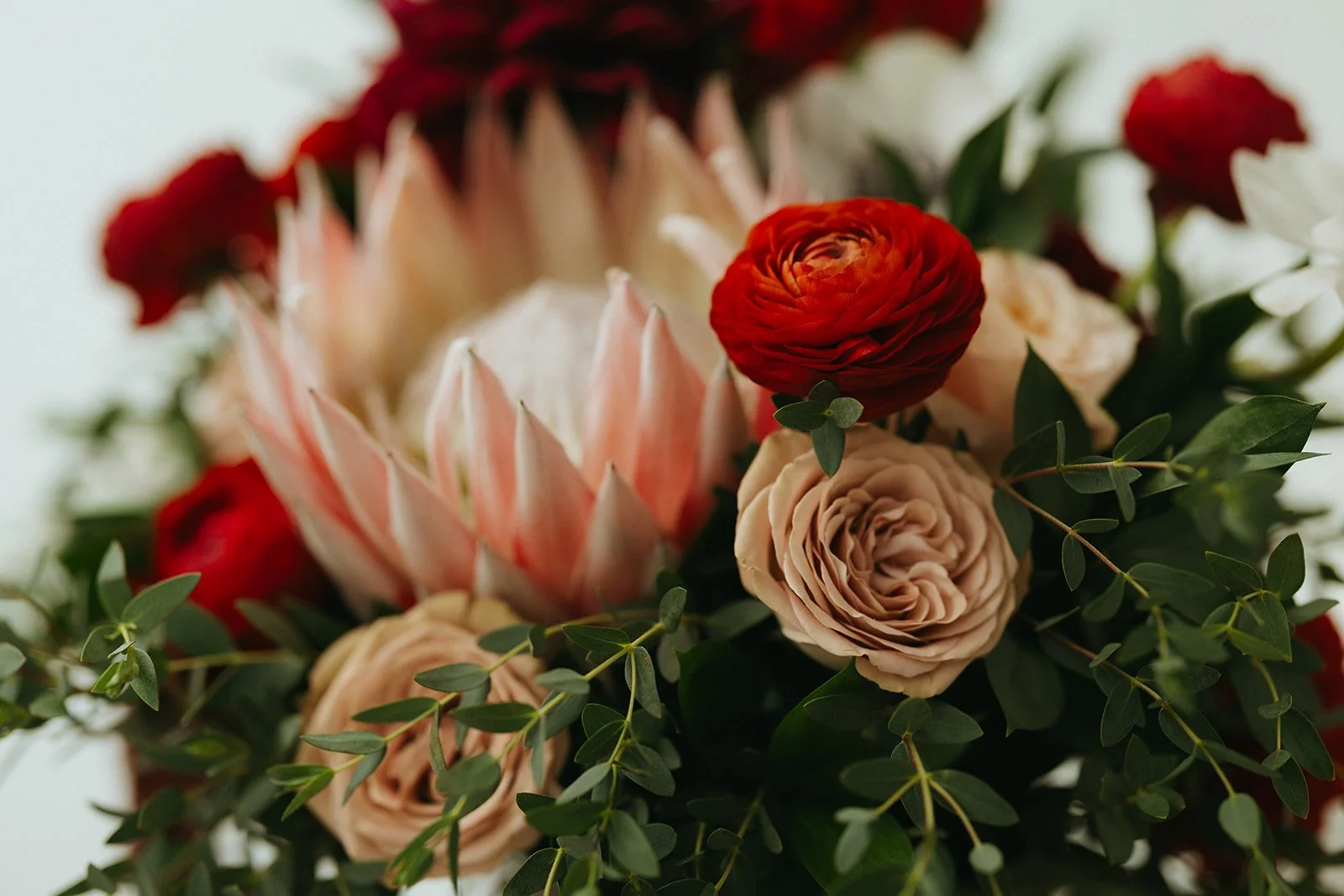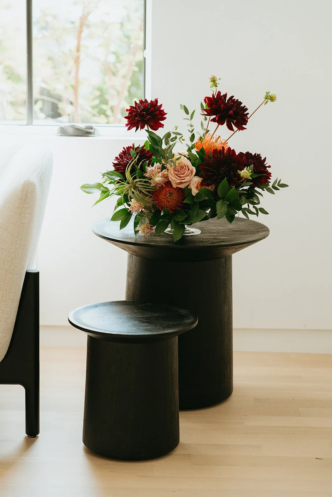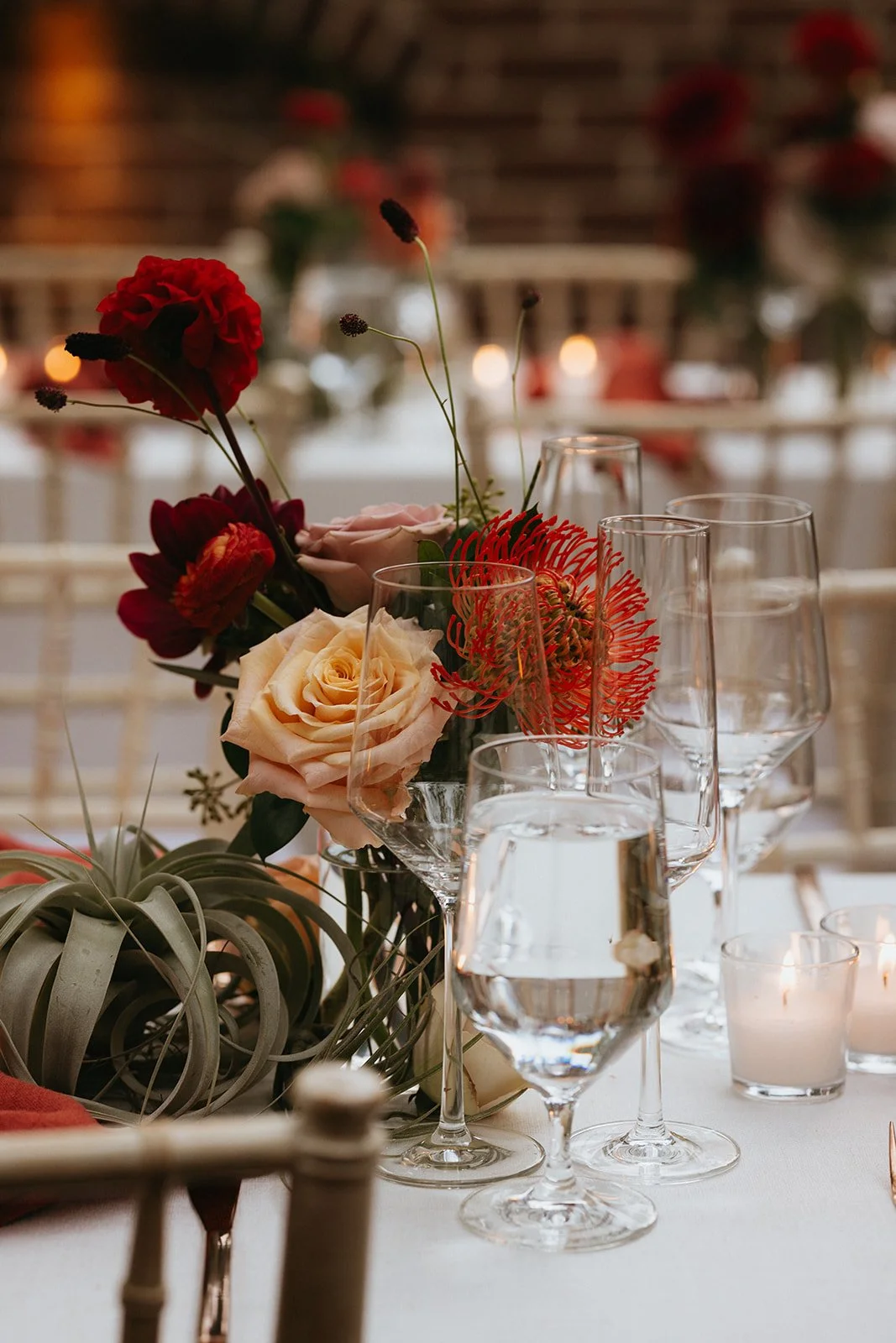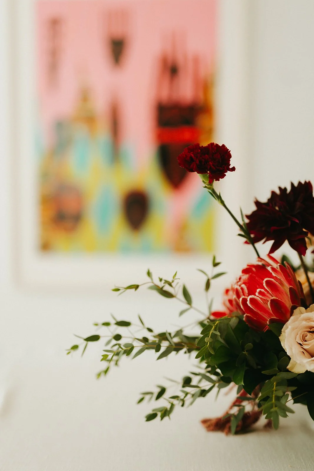 This intimate, at-home wedding in Cambridge, MA was designed as a warm, richly layered celebration for close family and friends. Sculptural protea, locally grown dahlias, and textural air plants created depth and movement while keeping the overall design organic and refined. A palette of burgundy, rust, and plum tones complemented the architecture of the home, enhancing the space without overwhelming it.